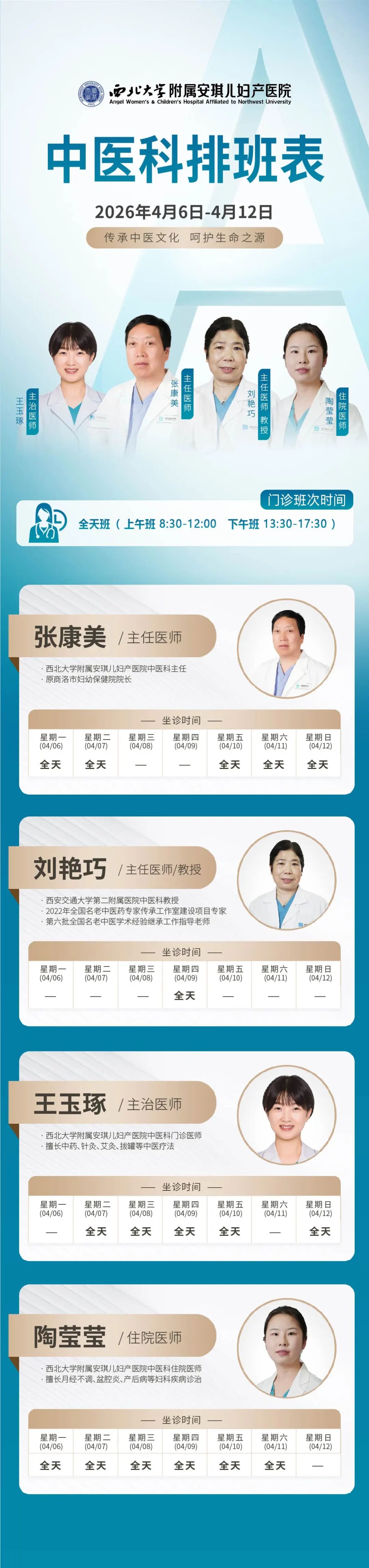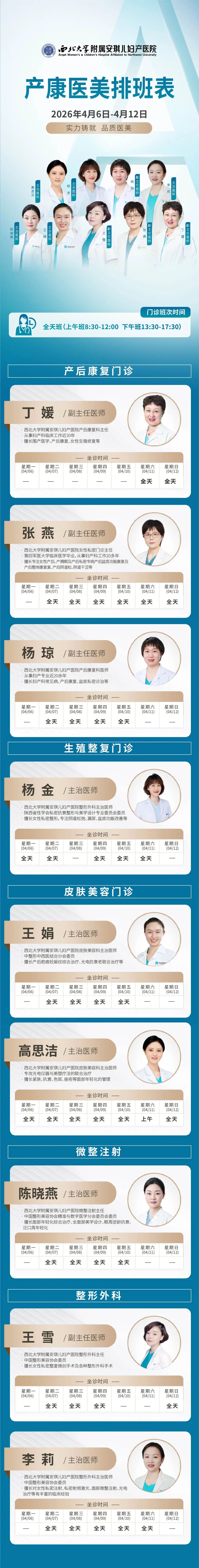 西安安琪儿妇产医院(4月6日至4月12日)专家坐诊时间表