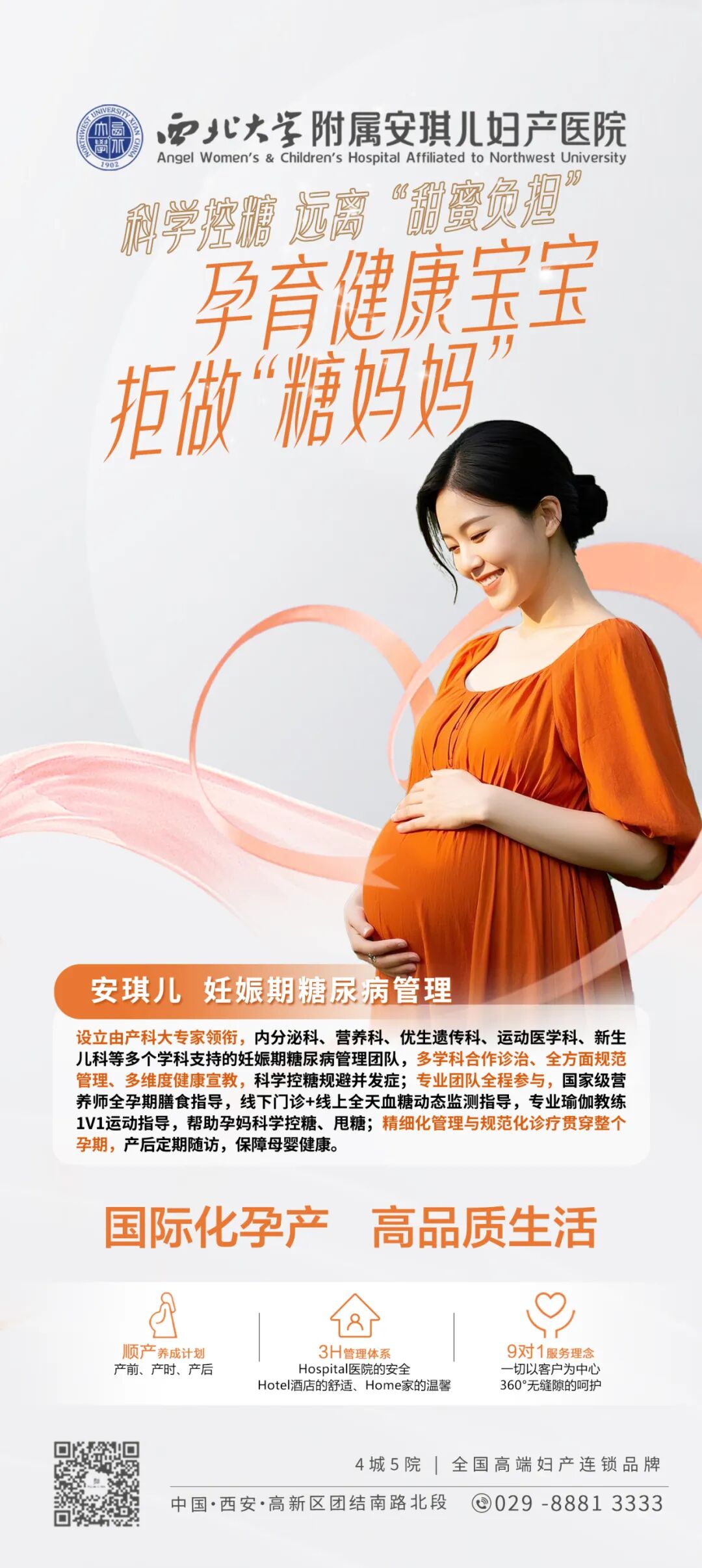 医院特别设立“妊娠期糖尿病”特色诊疗专科,由产科大专家领衔,内分泌科、营养科、优生遗传科、运动医学科、新生儿科等多个学科专家组成妊娠期糖尿病管理团队,从孕前-孕期-产时-产后,一站式全程化服务,早排查、早预防、早干预,设立多学科合作诊治、全方面规范管理、多维度健康宣教,科学控糖规避并发症;专业团队全程参与,国家级营养师全孕期膳食指导,线下门诊+线上全天血糖动态监测指导,专业瑜伽教练1V1运动指导,帮助孕妈科学控糖、甩糖;精细化管理与规范化诊疗贯穿整个孕期,产后定期随访,保障母婴健康。
